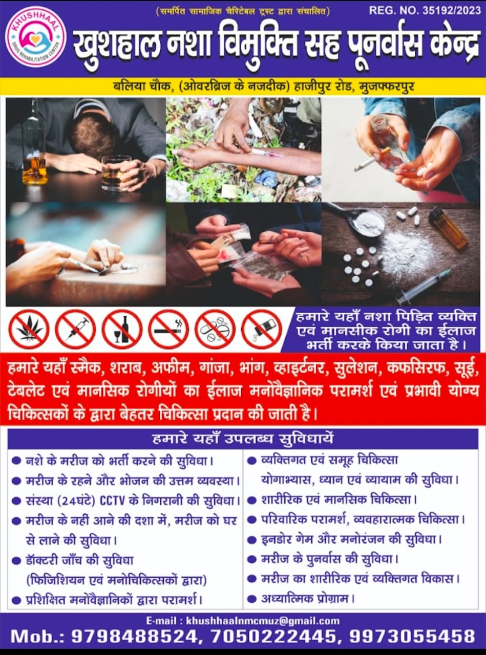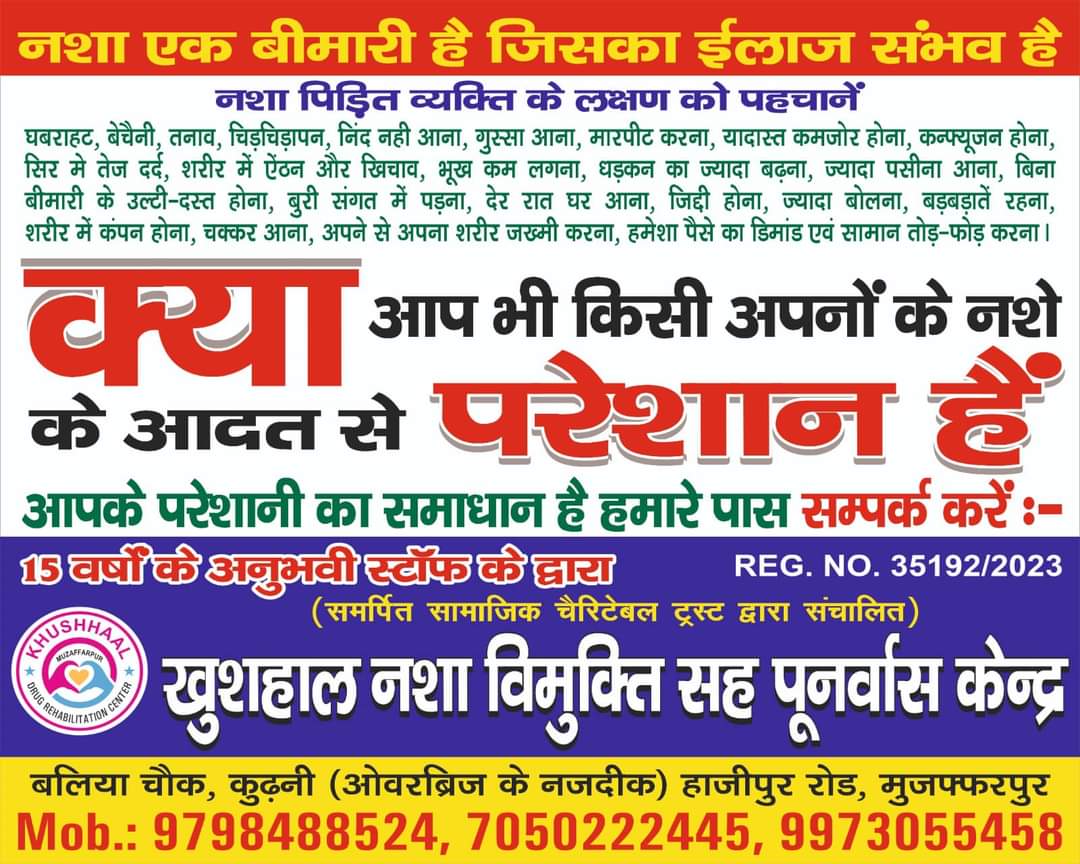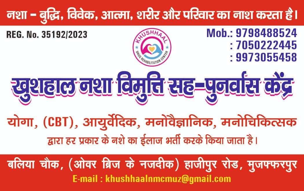 One of the Best Drug De-Addiction Centres in Muzaffarpur. I was extremely addicted to drugs that made me mad when I did not get drugs. My parents took me to ‘Khushhaal Nasha Vimukti Sah Punarvas Kendra’ 6 months ago for recovery. They treated me with Politeness and various treatment procedures. Now, I am far better than the previous situation. Very Satisfied.